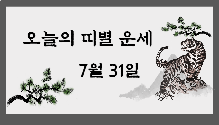 7월 31일 일요일 오늘의 운세 전해드립니다. 7월의 마지막날인 오늘! 과연 나의 운세는 어떤 운세일까요~? 오늘 보는 운세가 좋게 나온다면 오늘 하루는 기분 좋게 보내시면 됩니다. 혹여나 운세가 좋지 않게 나오더라도 너무 실망하지 마세요. 오늘 하루는 행동과 언행을 조심하고 다가오는 내일을 준비하는 하루로 보내면 좋을 것 같습니다.